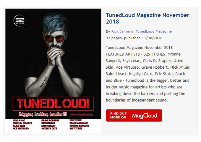 TunedLoud Magazine November 2018 – FEATURED ARTISTS – 32STITCHES, Yvonne Sangudi, Skyla Mac, Chris D. Staples, Alien Skin, Ace Virtuoso, Grave Robbert, Nick Miller, Saint Heart, Kaytlyn Cate, Eric State, Black and Blue – Tunedloud is the bigger, better and louder music magazine for artists who are breaking down the barriers and pushing the boundaries of independent sound.